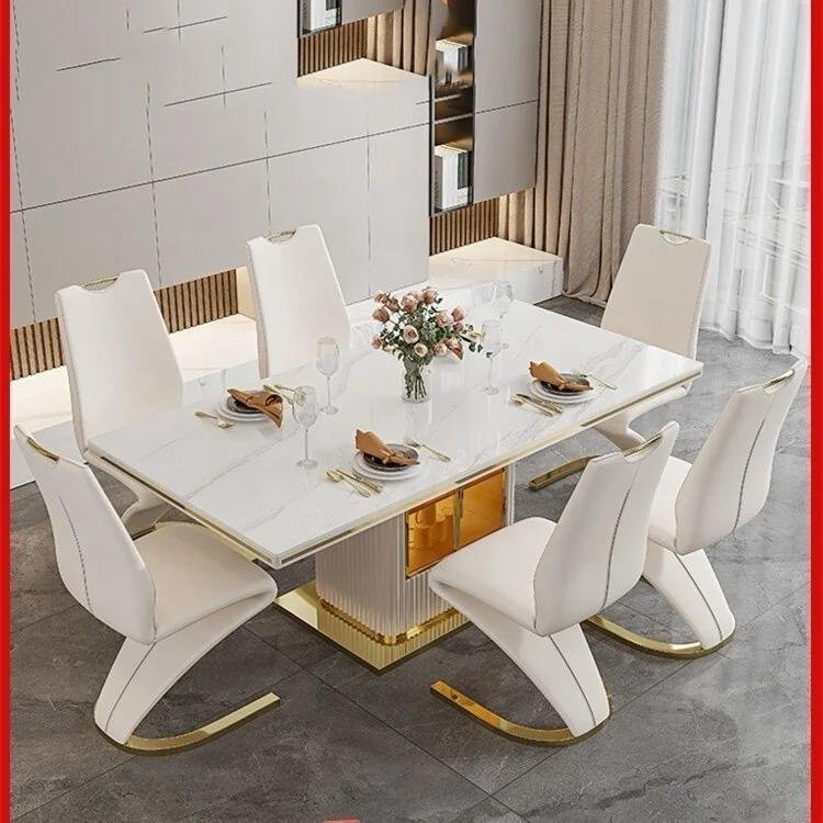 Ayva Marble top Dining Table, Stainless Steel Base with under bar and storage